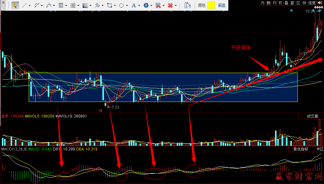 那么這個(gè)時(shí)候利用MACD來(lái)判斷該股是不是處于底部首先我們來(lái)看股價(jià)在箱體里,MACD指標(biāo)的變化從圖中可以看出該股在箱體內(nèi)運(yùn)動(dòng)時(shí),MACD指標(biāo)在數(shù)值為負(fù)值之下,形成了四次金叉而且金叉的位置一次比一次高,什么該股的底部位置在抬高,那么更可以斷定這個(gè)股是不是在底部區(qū)間,然后我們?cè)诮Y(jié)合箱體間量能的變化,可以看出,該股在在箱體類(lèi)運(yùn)動(dòng)時(shí)上漲都是放量,下跌回調(diào)都是無(wú)量。