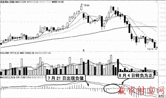 如圖所示,深赤灣A (000022)在2009年5月到7月走出一路上漲行情,MACD指標(biāo)大部分時間都是正值,直到7月21日股價出現(xiàn)較大幅度下跌,MACD才重新回到負(fù)值。8月4日,MACD從負(fù)值轉(zhuǎn)成正值,此時按照MACD由負(fù)轉(zhuǎn)正的規(guī)律,股民進場購買股票。