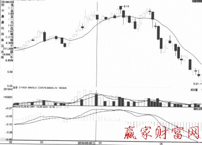 模塑科技(000700)于2010年3月16日開始上漲,MACD曲線也一直處于上漲狀態。3月30日,MACD值為+0.15,小于上一個交易日的MACD值,說明股價上漲已經接近了尾聲,穩健的投資者應該在此時拋出籌碼。雖說在之后的交易中股價再次創出祈高8.14元,可是MACD指標中的紅色柱線比之前變得更短了,證明空方力量遠大于多方力量,激進的投資者應該在此時應果斷離場。此后該股一路下拉,跌至5月21日的5.21元,跌幅達30%。如圖所示。