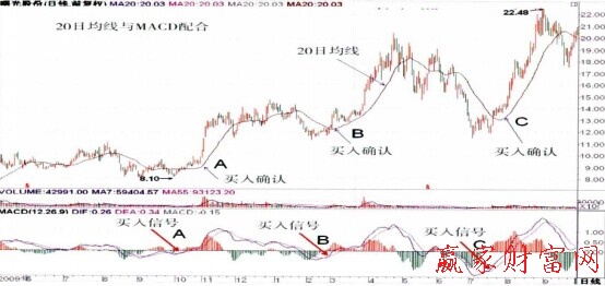 從圖中我們看到,2009年10月13 日 MACD指標發出了買入信號,隨后,10月29 日,20日均線確認了買入信號的有效性,這時應該立即買入進場。經過一段時間的調整,2010年2月12日,MACD指標發出了買入信號,隨后3月1日,20 日均線確認了買入信號的有效性。這時又是一個買點。經過一波上漲,股價開始回落。7月14日和7月16日,MACD指標再次發出買入信號,28日,20日均線也發出了買入信號,確認了信號的有效性。