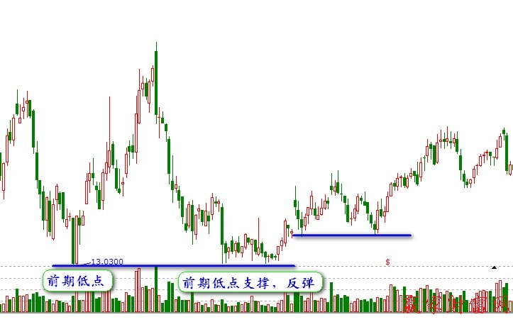 當(dāng)然,如果股價(jià)跌破前期低點(diǎn)支撐,那么前期低點(diǎn)的作用將由支撐作用轉(zhuǎn)變?yōu)楣蓛r(jià)反彈的阻力;同樣,如果股價(jià)突破前期高點(diǎn),那么該位置的阻力作用將轉(zhuǎn)變?yōu)榛卣{(diào)中的支撐。投資者靈活使用,分析時(shí)配合