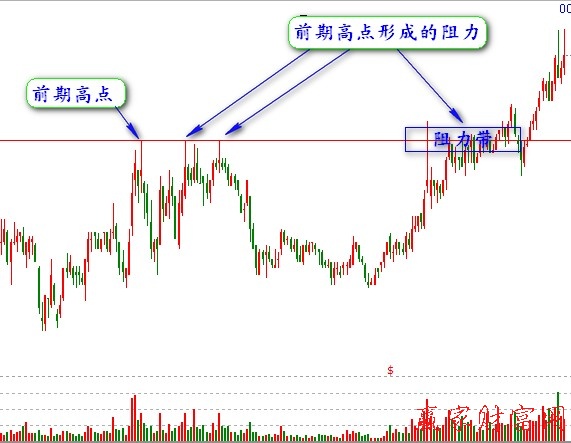2、前期高點(diǎn)阻力。與前期低點(diǎn)相似,前期高點(diǎn)不一定是波段最高點(diǎn),但是該位置會(huì)對(duì)當(dāng)前的股價(jià)形成一定的阻力作用。其原因有兩個(gè):①前期高點(diǎn)附近進(jìn)入的套牢盤,因?yàn)榻咏杀荆媾R著很大的拋壓;②底部獲利籌碼尋求變現(xiàn),會(huì)隨著接近前期高點(diǎn)逐漸變大。