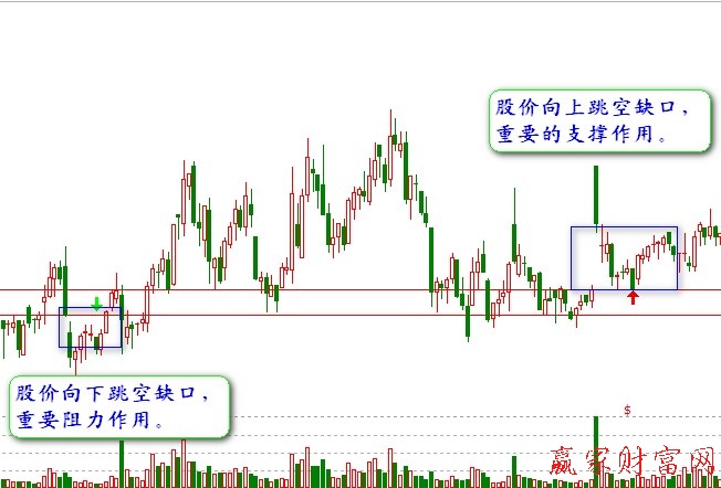 六、缺口形成的阻力或支撐作用。缺口位置沒(méi)有成交,是成本和套牢盤的隔離帶,其支撐或阻力作用是非常明顯的,如果股價(jià)回踩向上跳空的缺口,則缺口位置是重要的支撐位;如果股價(jià)上攻向下跳空的缺口,則該位置是重要的阻力位。