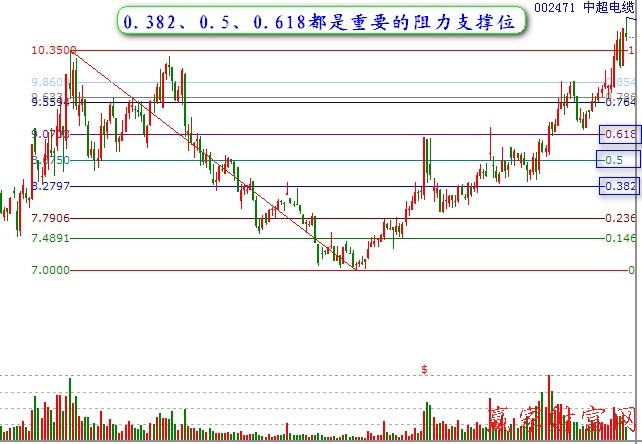 七、重要的黃金分割位及江恩八分位。江恩強(qiáng)調(diào)50%回調(diào)位置的支撐作用。黃金分割的0.382、0.5、0.618都是重要的支撐和阻力位,具體起到的是阻力或支撐作用根據(jù)其當(dāng)前股價(jià)來(lái)確定。