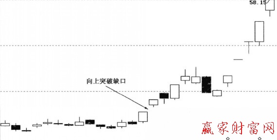 3.在接下來的幾天里,該股股價迅速脫離缺口區(qū)域,并一路上升,向上突破缺口的形態(tài)基本確立,投資者可逢低加碼買進。