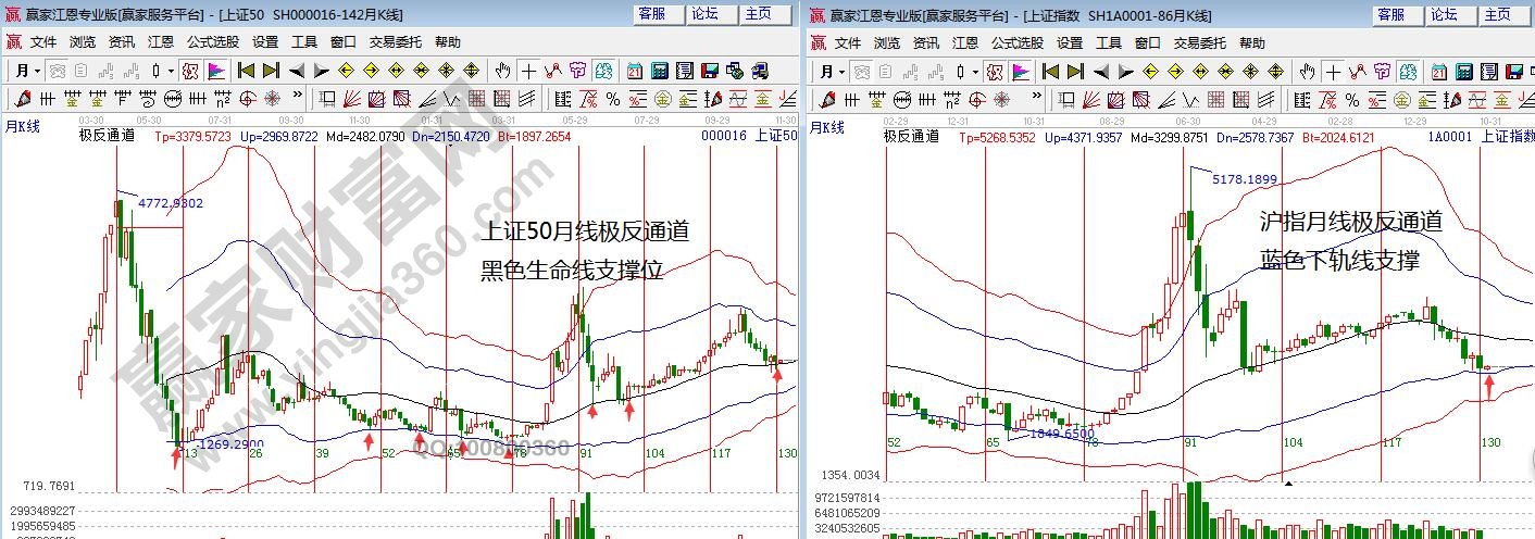 贏家江恩十六字投資真言“看大做小,看長做短,牛長熊短,紅肥綠瘦”,認(rèn)為此處是中期底部的緣由如下圖,上證50、滬指月線圖,K線分別在極反通道生命線、藍(lán)色下軌線支撐處,歷史上無數(shù)重點(diǎn)的拐點(diǎn)都是在極反通道五條線上產(chǎn)生。研究歷史、預(yù)測未來,如果你想搞清楚自己所持個股的重要拐點(diǎn)在那里,請留言聯(lián)系我們,用圖表給你展示。