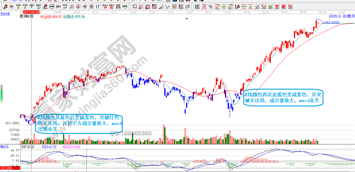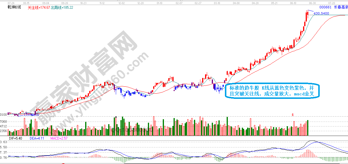 選好了大方向,我們?cè)儆泌厔?shì)工具乾坤K線判斷分析。贏家十六字投資真言中:牛長(zhǎng)牛短,紅肥綠瘦。用乾坤K線,大家看兩市最貴的股票貴州茅臺(tái)以及長(zhǎng)春高新,可以得到很好的答案。首先紫色K線代表多空轉(zhuǎn)換,重點(diǎn)關(guān)注多空轉(zhuǎn)換的位置,當(dāng)K線從藍(lán)色變成紫色,另外再配合成交量,要是成交量放大,并且macd再金叉,成功率基本可以達(dá)到100%了。