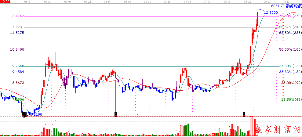 最近有一個朋友比較看好渤海輪渡(603167),今天就介紹一下這樣的股票操作方式。首先這只股票是短線操作,我們就要從短線的思維去考慮。最引人注意的時候就是9月4日的漲停。那么那時候是否可以參與,叢規則上來看是可以參與的。首先從日線上來看,這股票在前期在9.45到10.64之間是一個拋壓區,4日這股票一根漲停突破了這個壓力區,白線強勢的走勢。這時候參與是比較安全的。