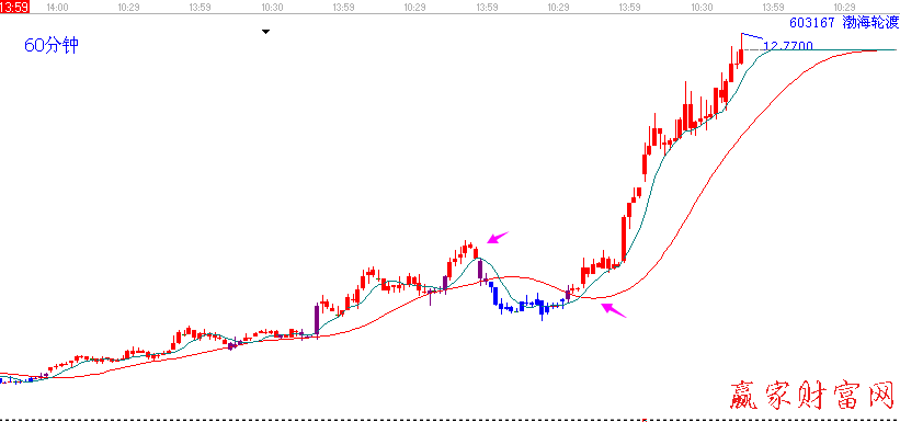 從上圖中我們可以看到從9月1日開始乾坤k線變為紅色,這就是表示這只股票已經可以參與,最安全的時候是在突破9.75位置之后打開更大的運行空間。從時間上看,可以看到這只股票是開始一個新的循環,開始新的走勢。從這些都可以看出:我們可以參與這只股票。關于具體怎么具體操作這只股票,以及在遇到小的回調的時候我們應該怎么把握。我們可以通過分時圖來看。下面主要看30分鐘、60分鐘來看,這是我們做短線經常來看的。依然從乾坤k線來看。