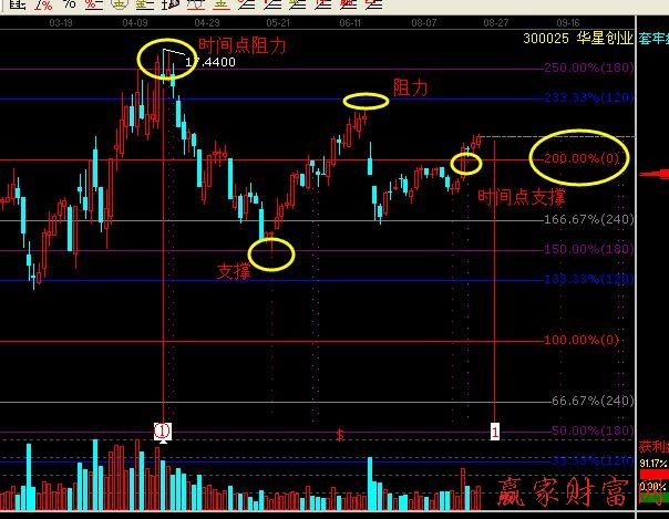 從圖中,我們可以看出該價格圖是只留了重要的百分比分割比例,其中在股價從高點17.44元回踩下來至180度位置(150%)時獲得支撐,并且時間點到了,時間到了,加上強支撐,股價上漲是很容易的,可以說時間對于股價來說是一個催化劑。如果在支撐上股價上漲起來很快,如果是在阻力下,那,那么股價下跌速度也是很厲害的,當然不排除橫盤的可能,具體情況要結合成交量來分析。