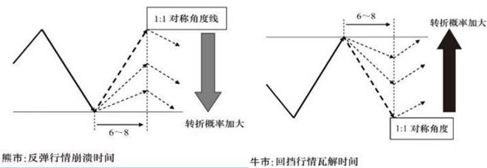 在進行逆勢計算行情的崩潰時機的時候,角度時間模型是非常重要的,這也是行情分析的關鍵所在。下面的兩張圖形顯示的就是這兩種角度時間模型是有針對性的,如果用錯了牛熊黃精,那么我們就得不償失了,這一點大家一定要注意。