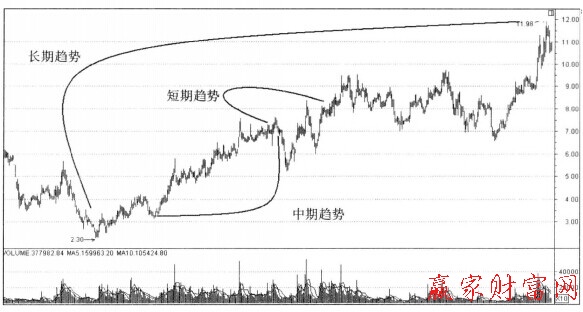 股市中股價波動的過程一般是由上述三種趨勢組合而成的。這三種趨勢也是相互關(guān)聯(lián)的,若千個中期趨勢組成一個長期趨勢,而一個中期趨勢又由若千個短期趨勢組成。