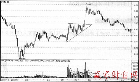 股價上漲的高點基本處于同一價位,回調的低點卻在不斷上移,股價波幅漸漸收窄,成交量不斷萎縮,不過在上升階段成交量較大,下跌時成交量較小。