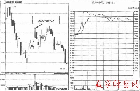 上圖為皖新傳媒(601801) 2010年5月28日的漲停板分時圖,圖中左側是此股在2010年5月28日前后的走勢圖,當日此股處在一波反彈上漲走勢之后,因而面臨著一定的解套拋壓。從當日的分時圖中可以看到,此股在早盤時間段出現了快速上封漲停板的走勢,但這種漲停板僅僅維持了十幾分鐘,隨后就被大單打開。考慮到此股正處于階段性反彈上漲之后,這既有可能是市場拋壓較為沉重的表現,也有可能是莊家誘多出貨的一種手法。在實盤操作中,這類個股一般還會出現一波短期調整。因此,此類股并不是我們短線追漲的理想品種。