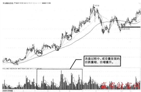 洗盤是上漲過程中的縮量調整,或者呈現的是價跌量縮、價增量升;出貨則是放量滯漲或放量下跌或在股價漲升過程中呈現出量價不規則狀態,甚至是在出現明顯的下跌趨勢之后,仍不見明顯的縮量。