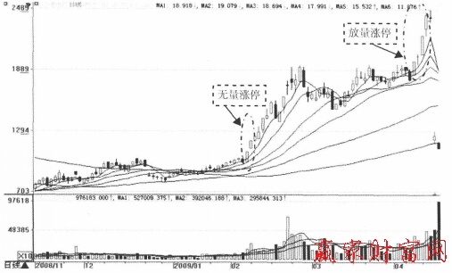 1 漲停可以分為無量漲停與放量漲停,如圖所示。漲停板戰法量價分析的關鍵就是要看成交量能的增減配合情況。如果成交量小,股票將繼續上揚